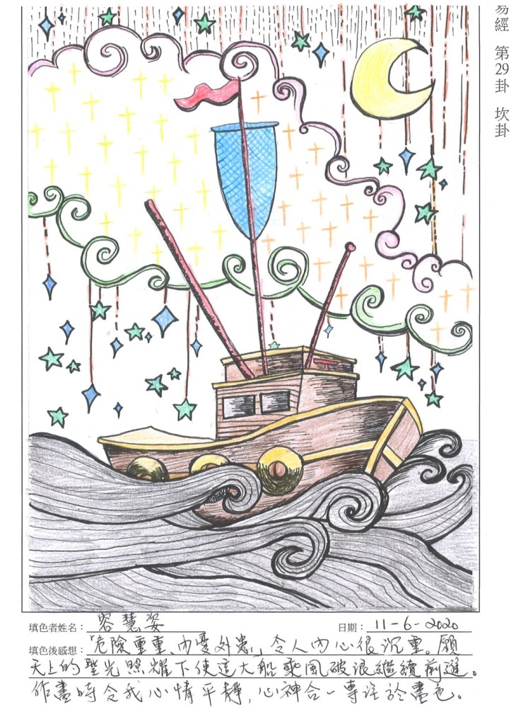 「坎」是重重危險的意思,象徵人生重大的難關與挑戰。面對內憂外患,四周滿佈危險而且似乎已沒有出路,人在這時,心情自然會焦慮挫敗。別要氣餒,天無絕人之路。只要堅定信念,保持樂觀的心境,環境再惡劣,也可以跨過的。主動出擊,還是會有收獲的。要爭取大的成就,便要遠離危險及耐心等待亨通之時。